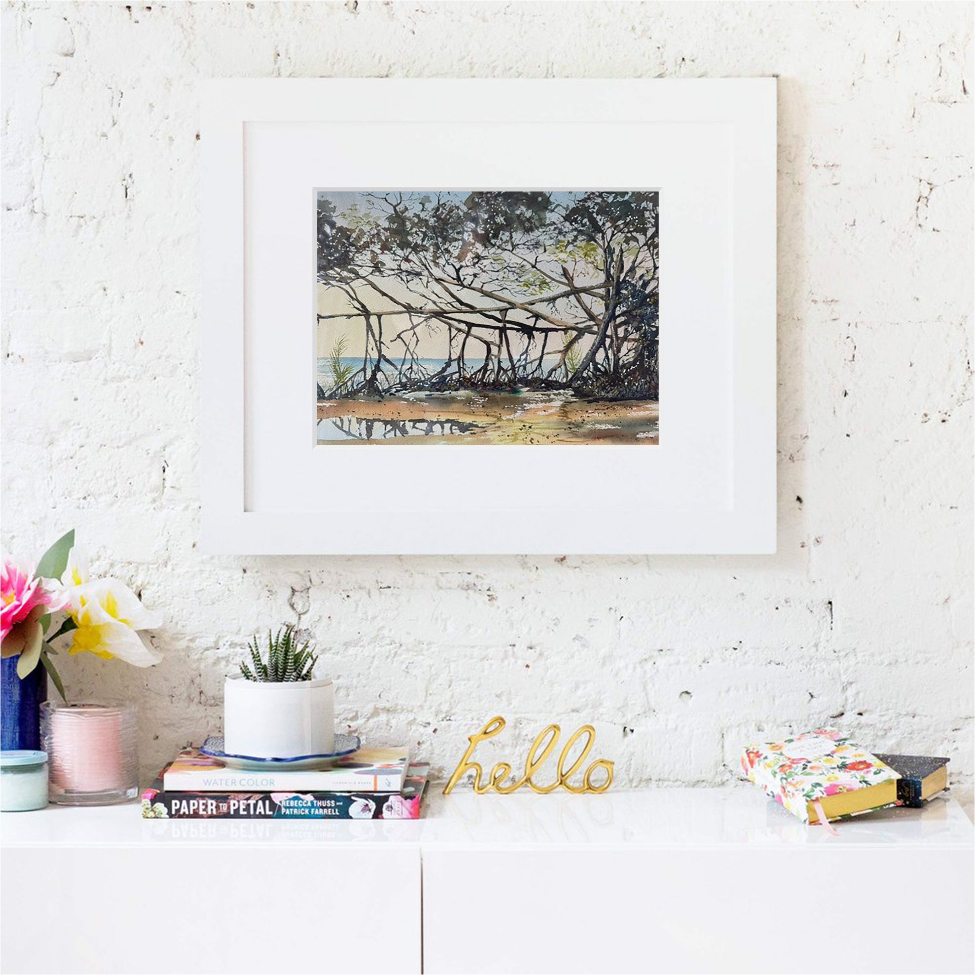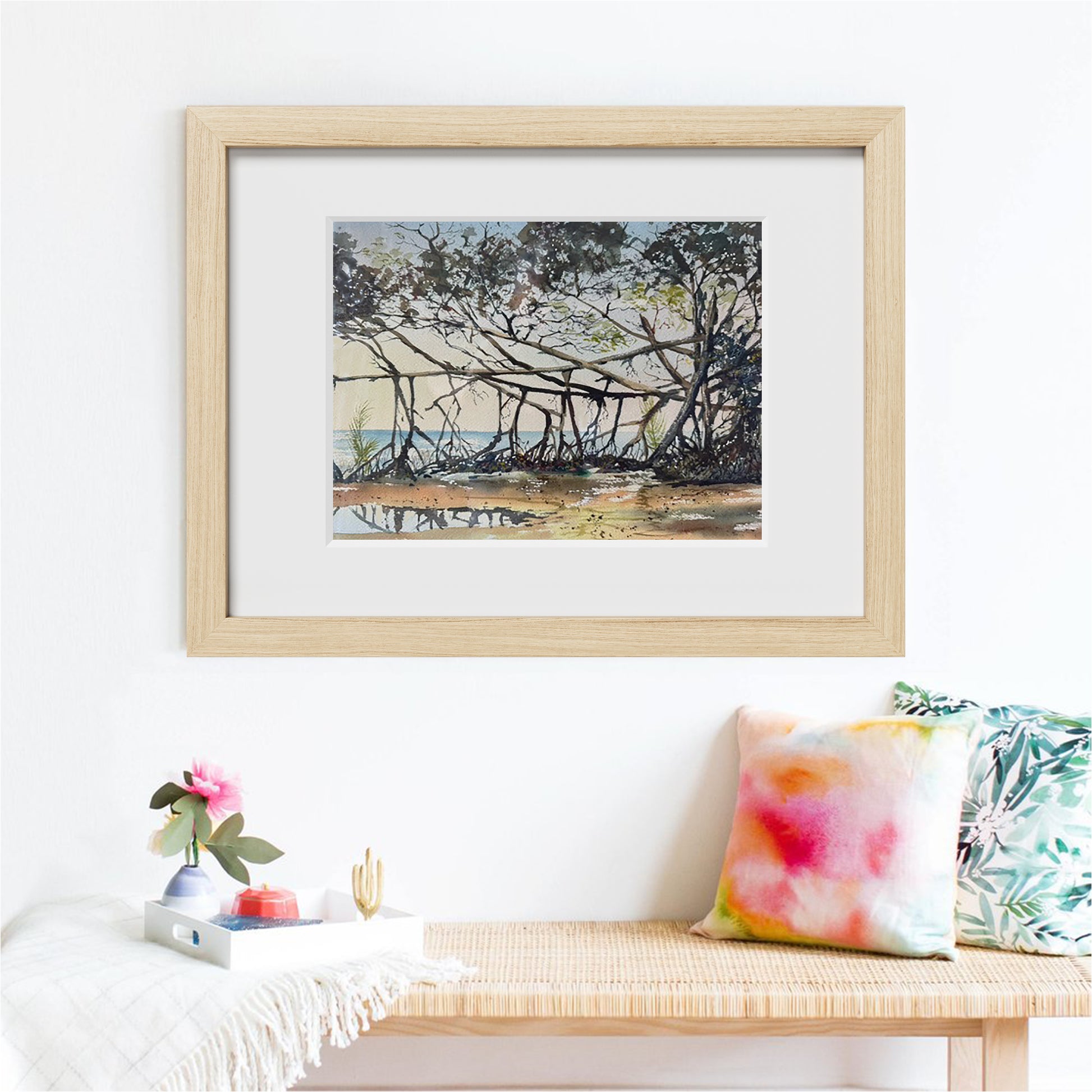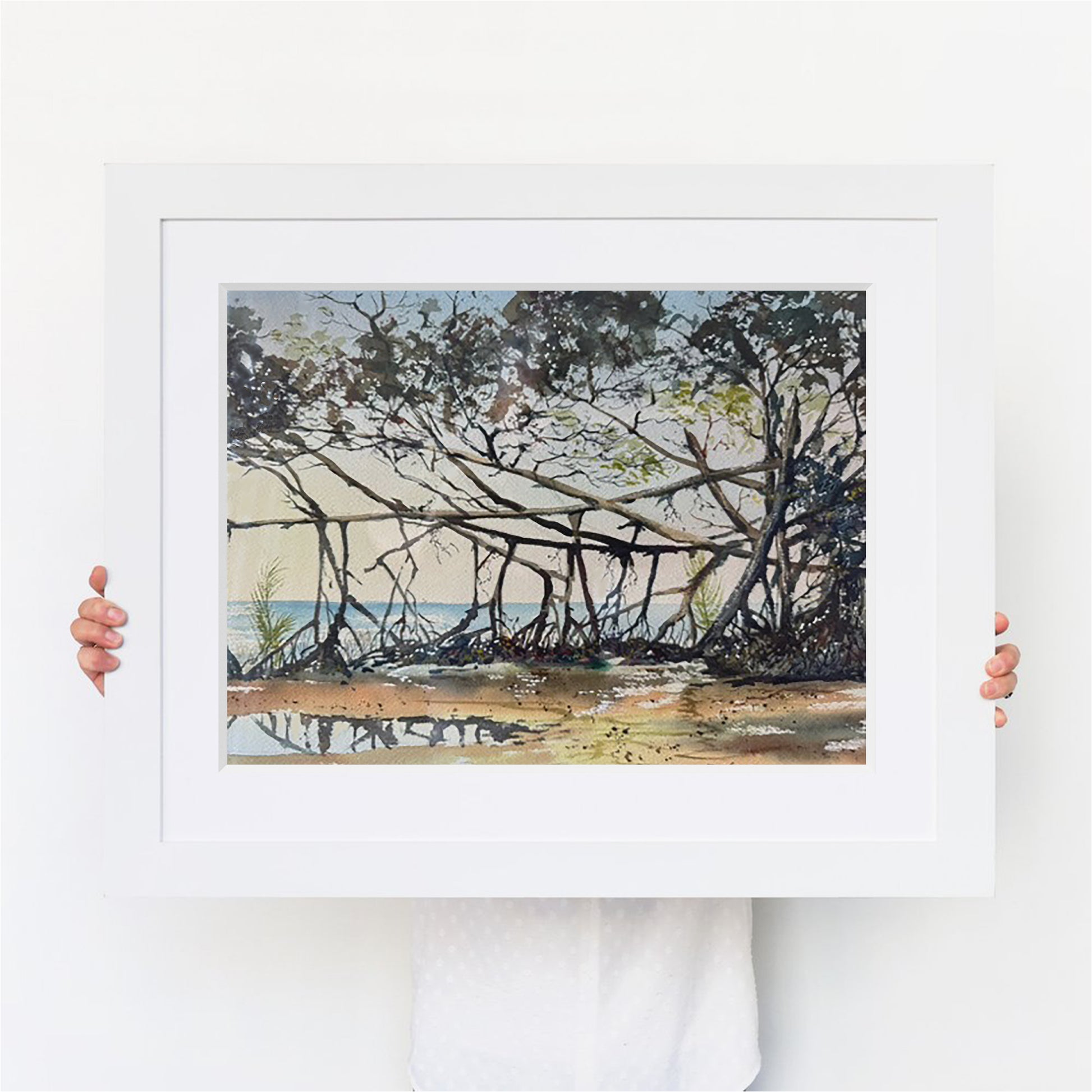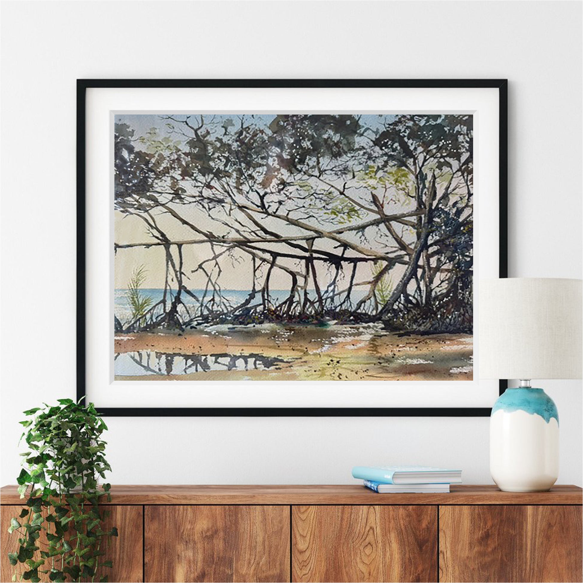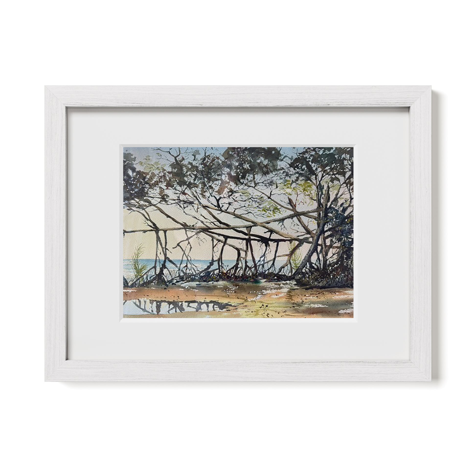This tranquil watercolor painting captures a quiet lakeshore framed by tangled, weathered trees reaching out over the sand. Soft reflections shimmer in shallow pools, while the serene blue water and pale sky evoke a peaceful, sunlit afternoon. The intricate network of roots and branches adds natural texture and movement to the scene. Ideal for nature lovers and coastal or rustic décor, this piece brings calm and connection to the outdoors into any space. Printed on archival-quality paper for lasting color and fine detail.