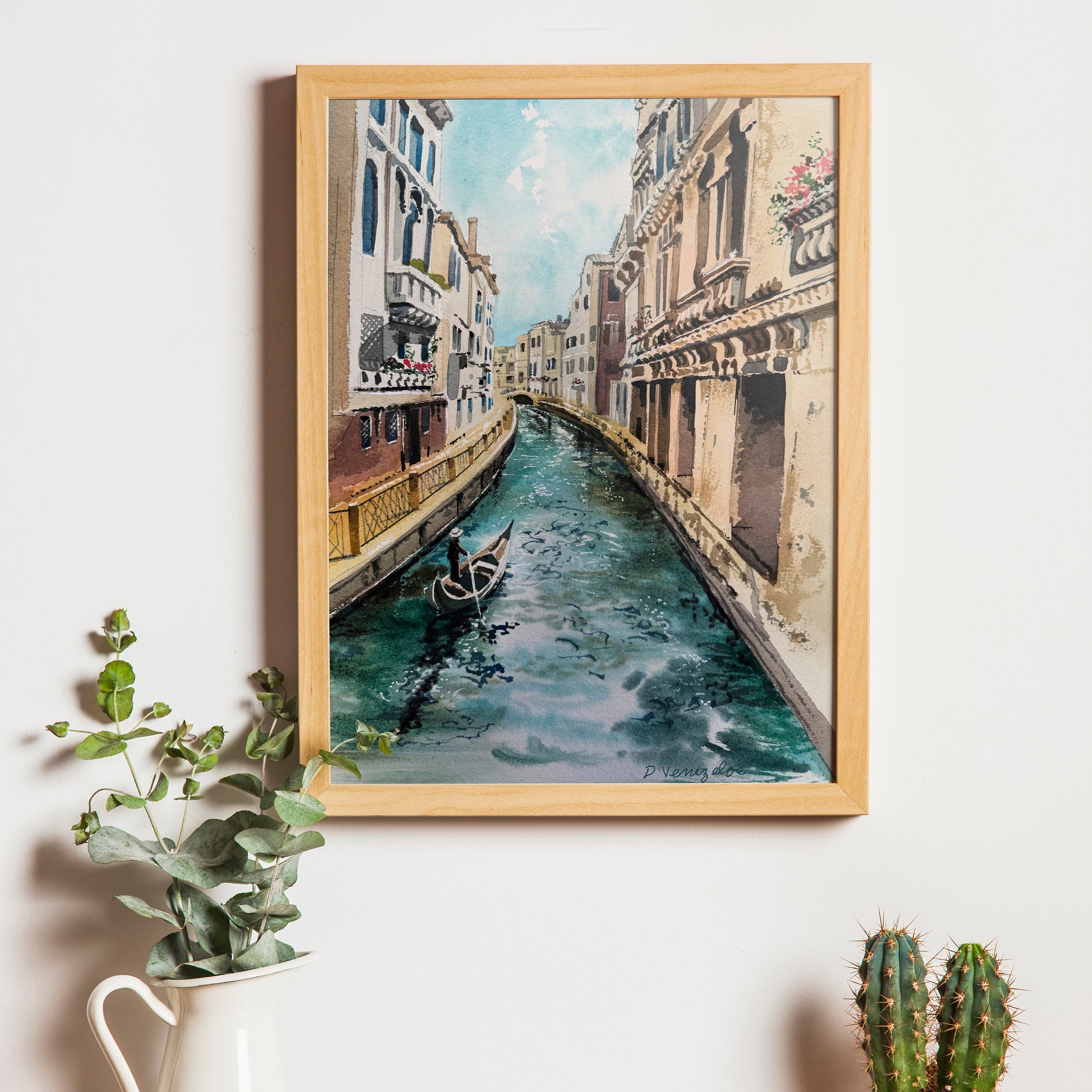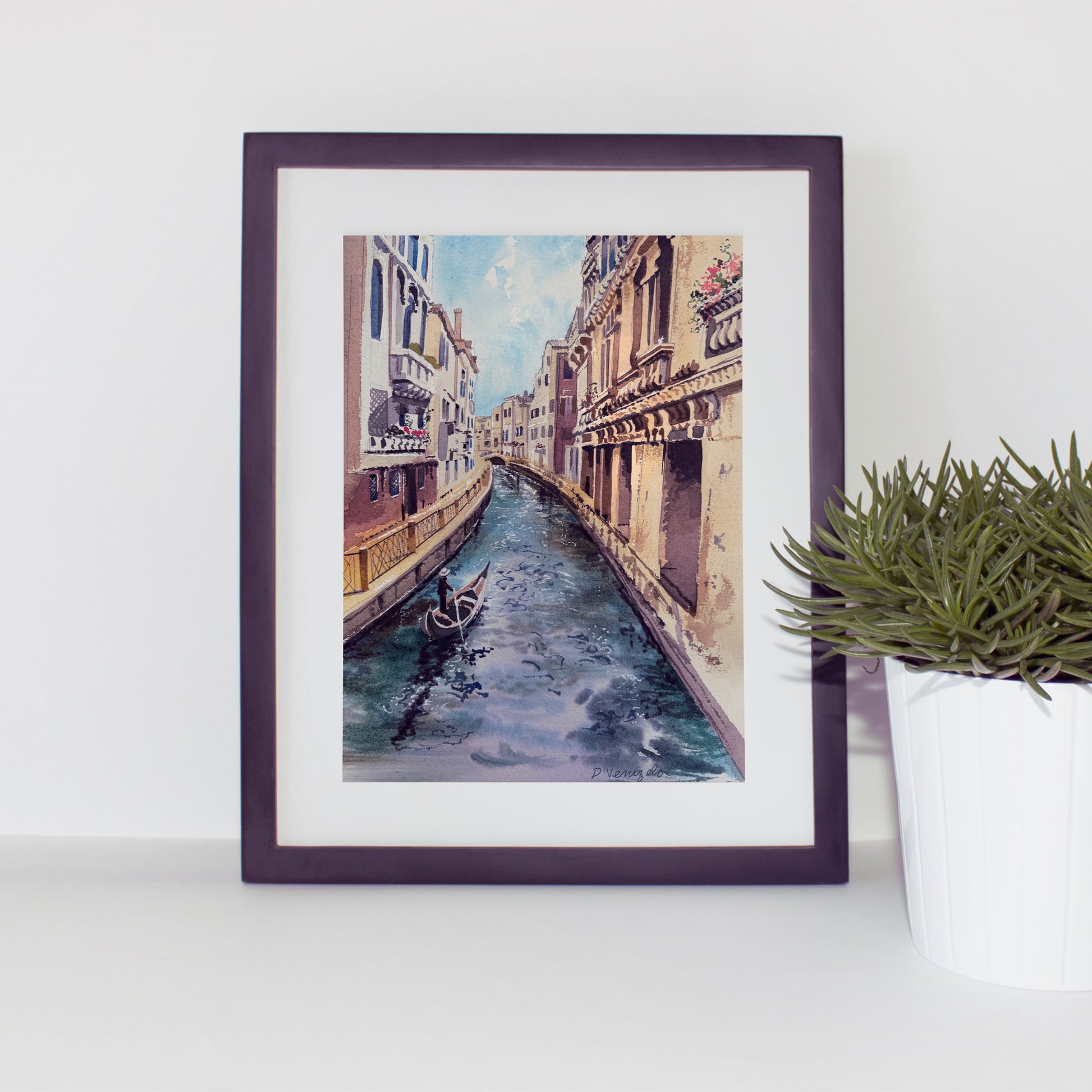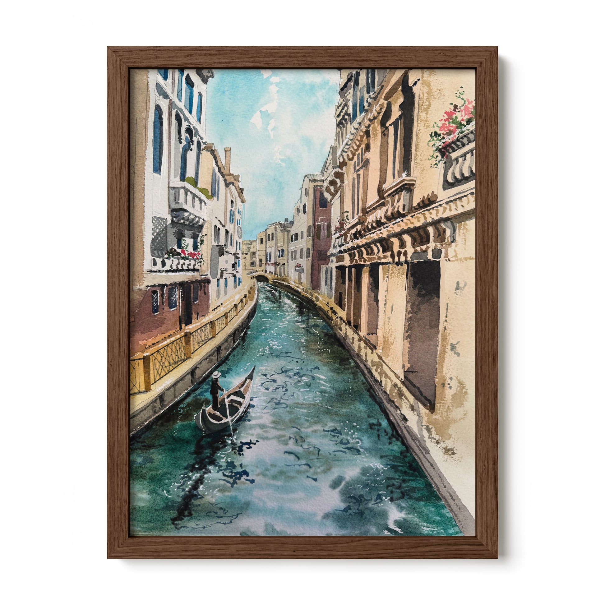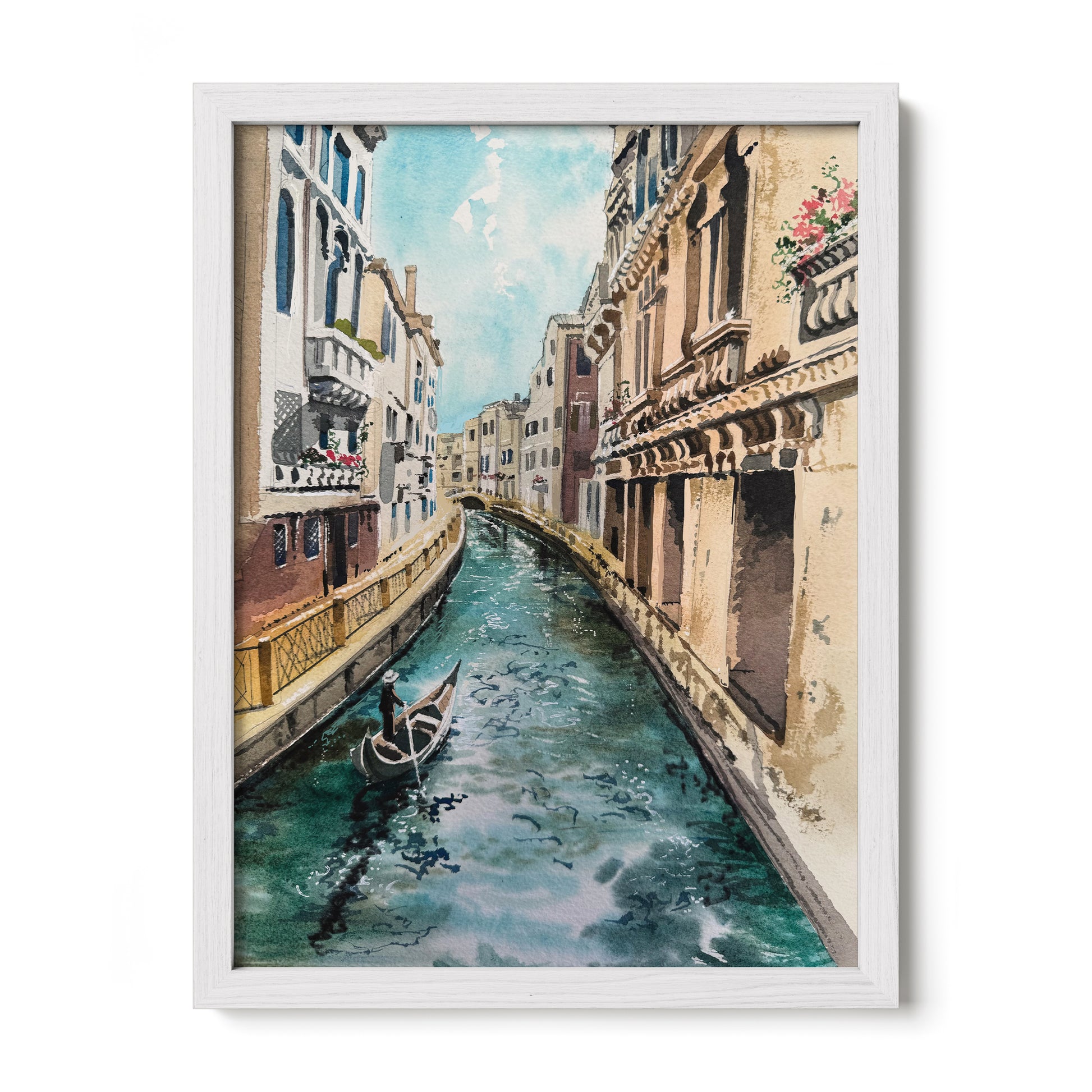This elegant watercolor painting captures the timeless charm of Venice, with a lone gondolier navigating a narrow canal lined with historic buildings and flower-filled balconies. The warm sunlight dances on the water's surface, reflecting the soft pastels and detailed architecture that define this romantic city. The composition draws the viewer in, creating a sense of movement and quiet serenity. Perfect for lovers of travel, European charm, and classic cityscapes, this piece brings a touch of Venice to any space. Printed on archival-quality paper to preserve its delicate color and fine detail.